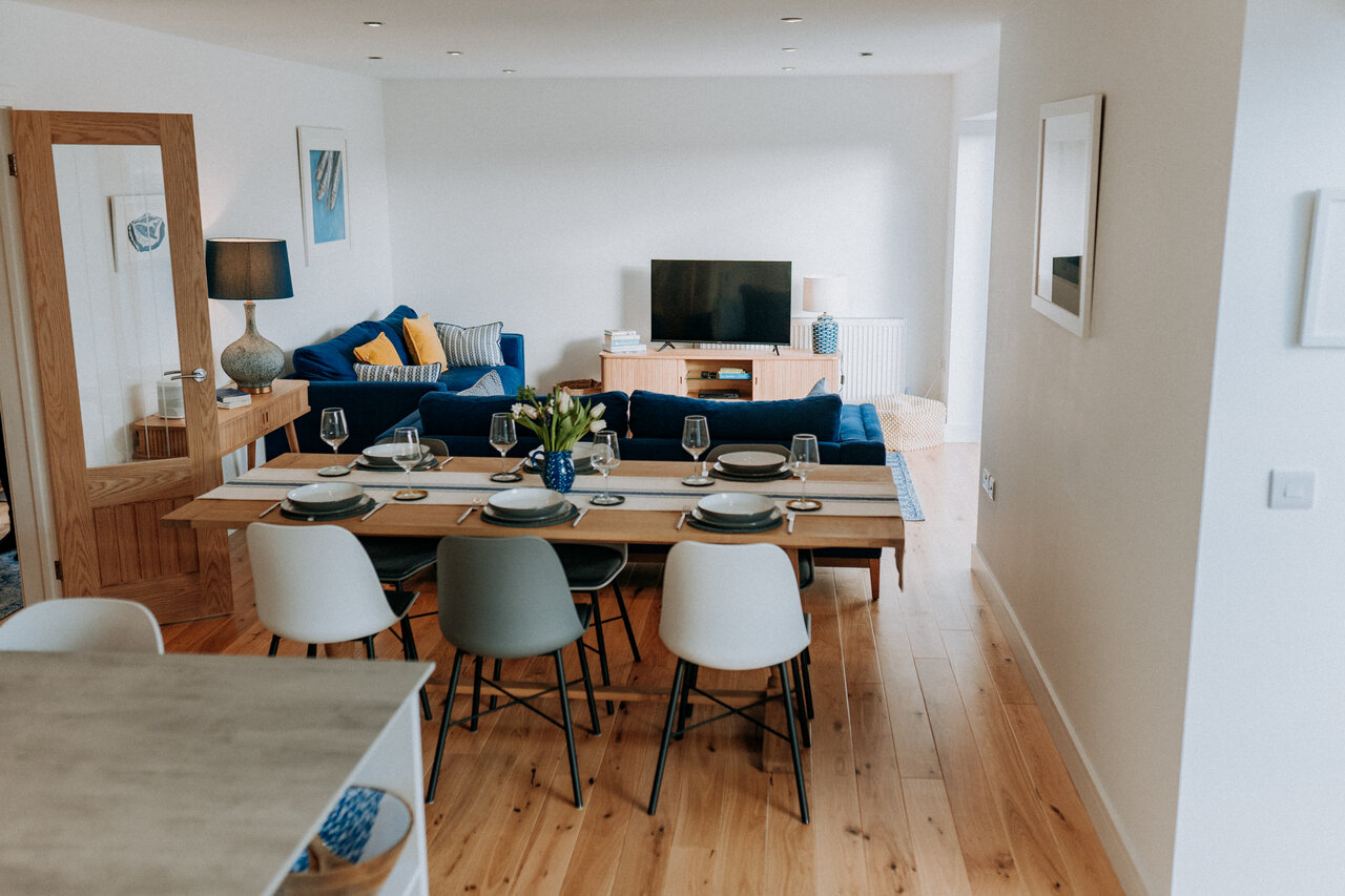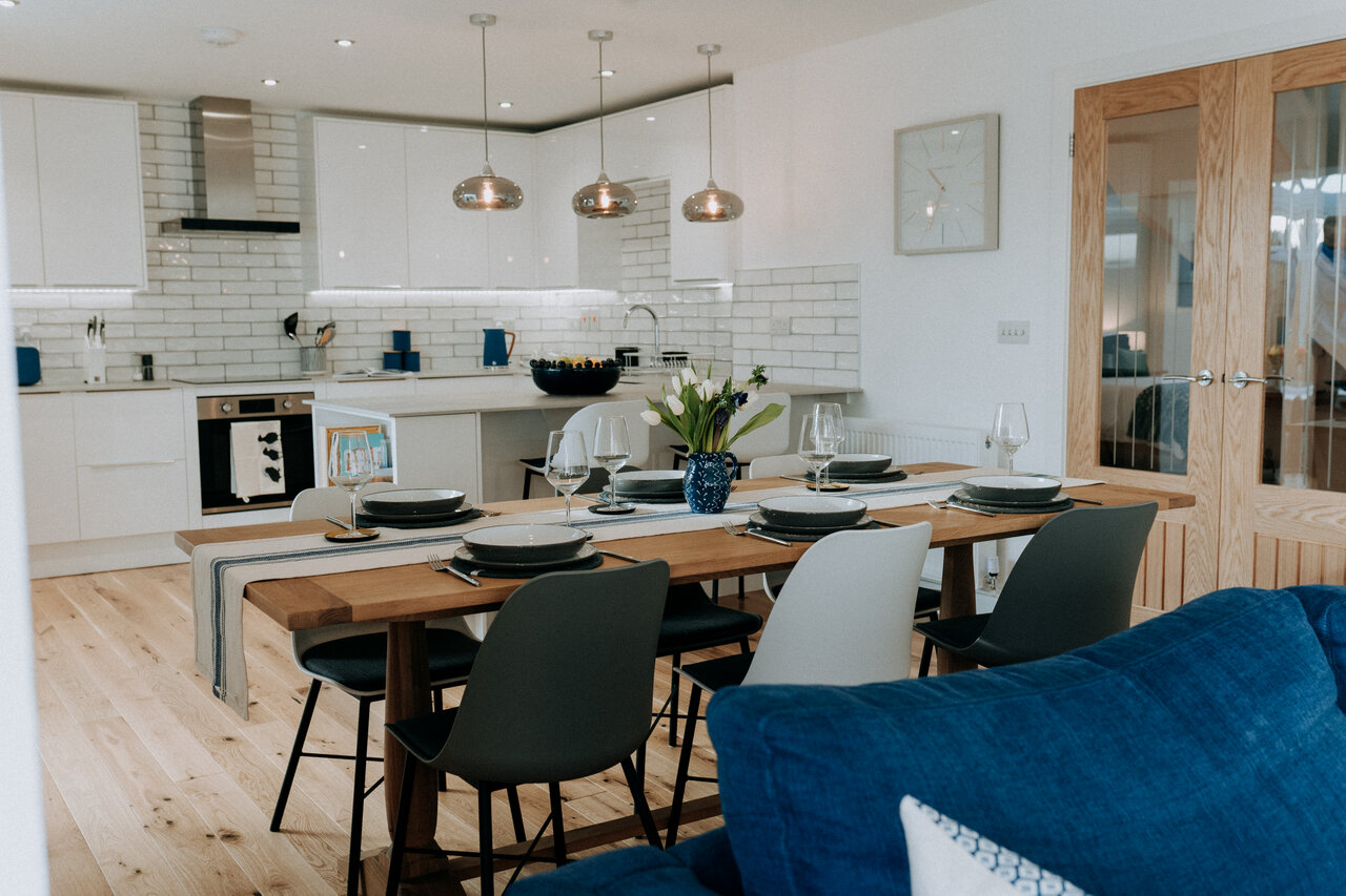 The colours throughout Y Môr really reflect the name (The Sea, in Welsh). White, blue and natural tones create a calming vibe and bright interiors that were a joy to capture. In terms of the features of the property, I really love the open plan living space where the kitchen leads to the dining area and through to the lounge area. I can envisage family evenings where there’s enough space for different things going on but then everyone is still together.